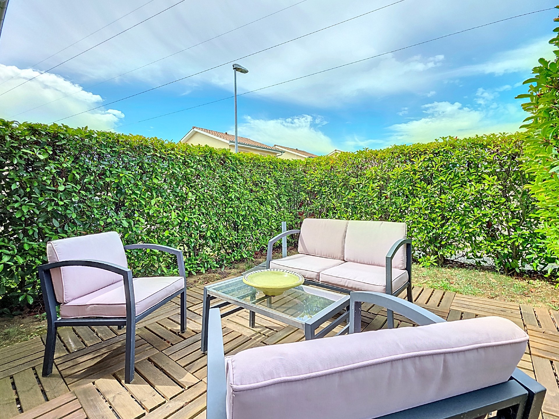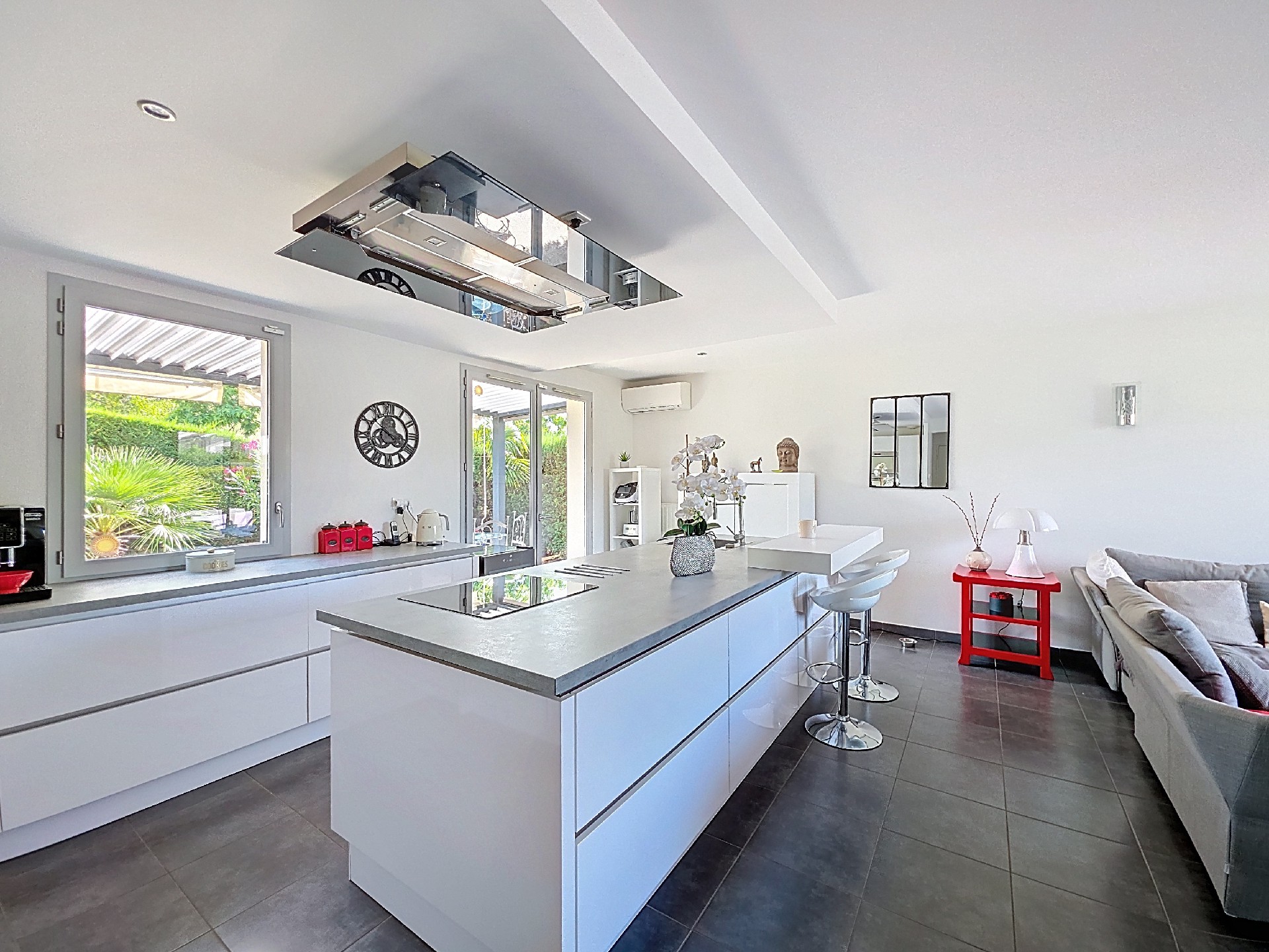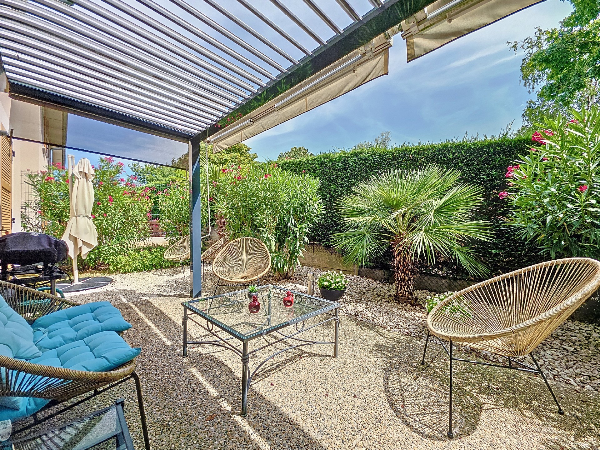– Pièce de vie avec accès direct au jardin sur les deux terrasses dont une avec pergola bioclimatique et stores bannes