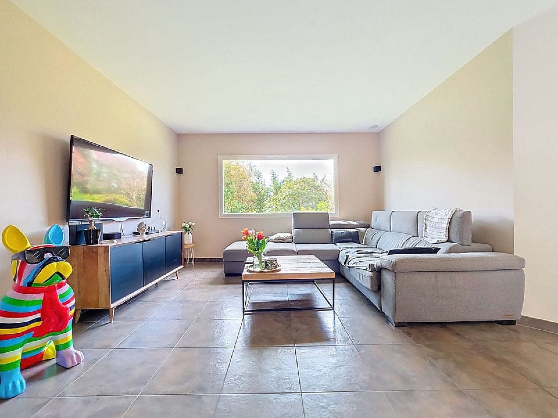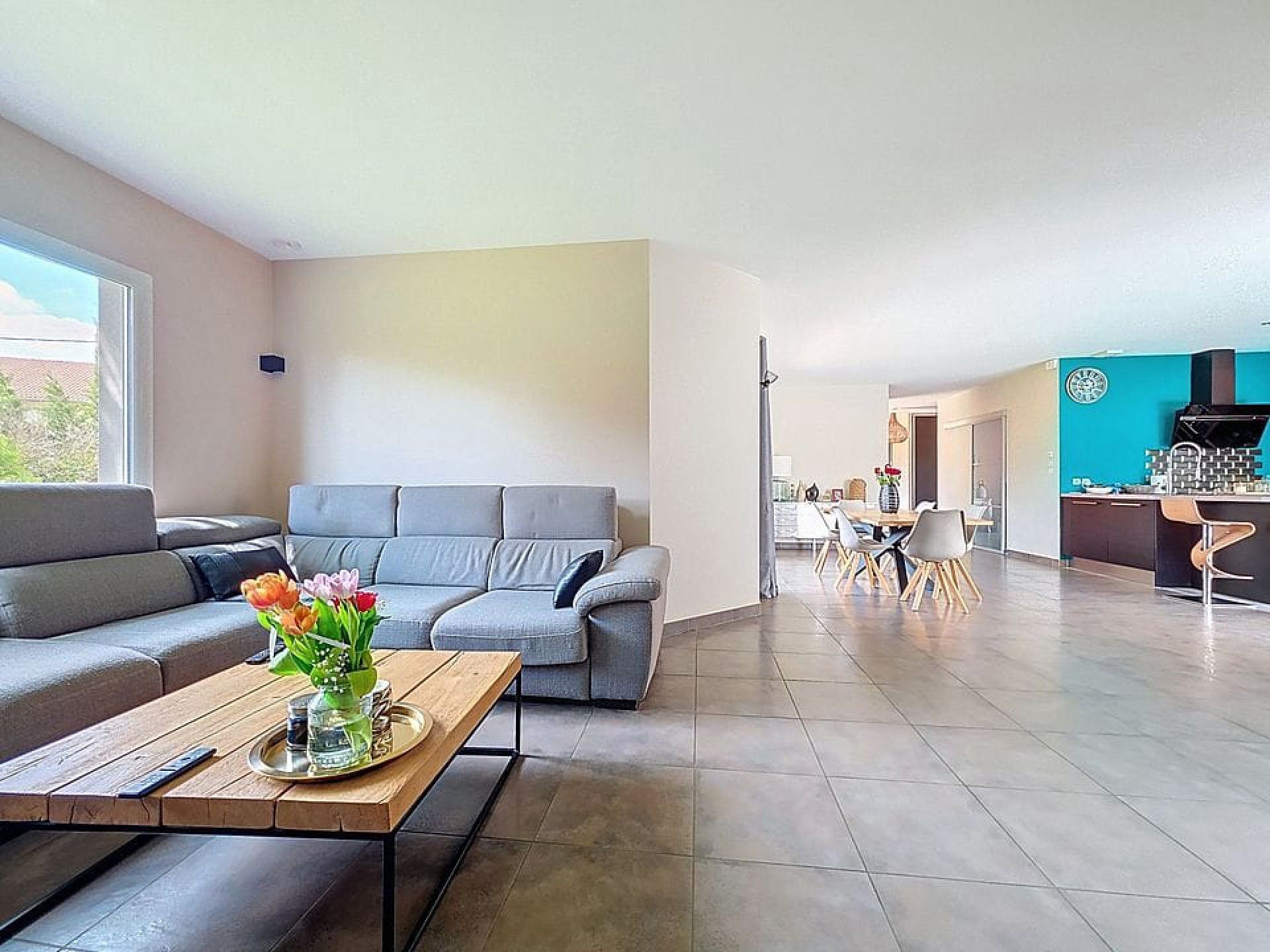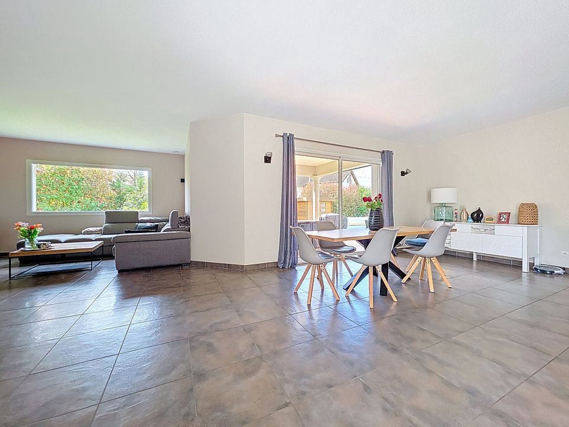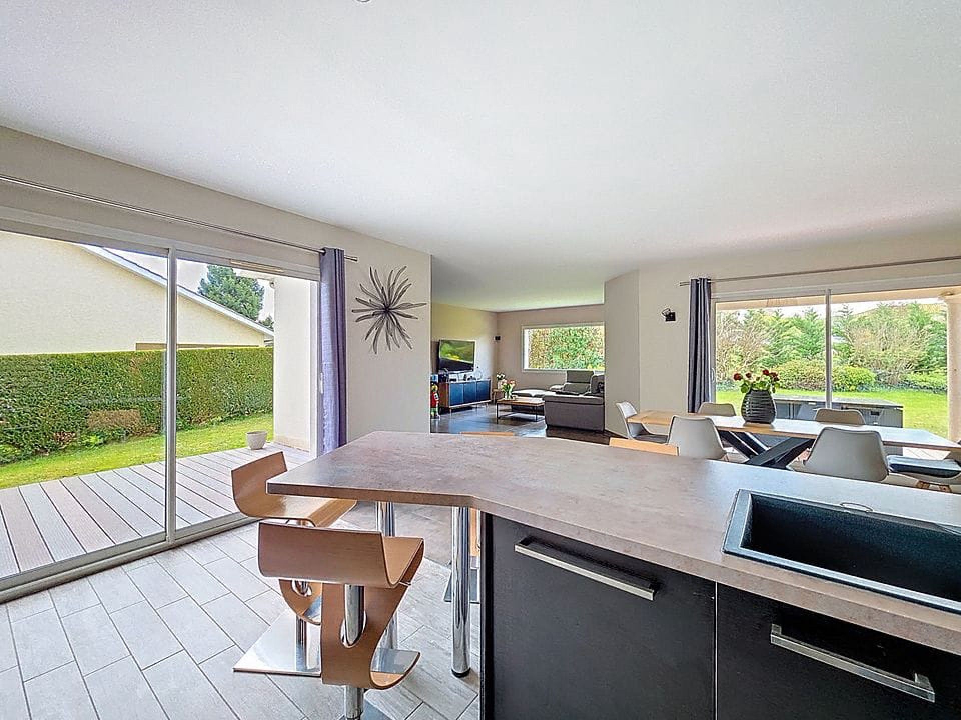 – Grande pièce de vie lumineuse et traversante, ouverte sur une terrasse plein Est et une grande terrasse de 60m² en bois exotique plein sud : 75m²